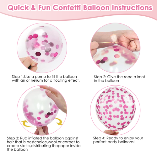 - 【 Confetti Balloon】Due to the pink confetti is heavier than helium, the confetti moves in the direction of gravity. Rubbing the outer side of the balloon on the hair (the best way )or silk, wool, will help the confetti stick to the balloon. A balloon pump is strongly recommended. This will make the balloons look more beautiful.