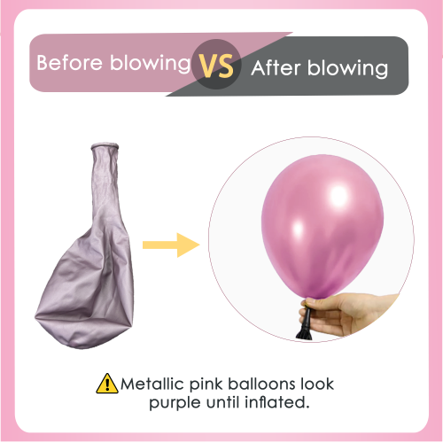 - 【Please note】Please avoid exposing the pink metallic latex balloons kit to high temperature, sharp objects or excessive friction to prevent bursting. It is normal for balloon to oxidize after being inflated for a period of time, please don't worry.