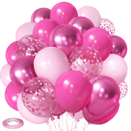 - 【Metallic Pink Balloons 】This hot pink confetti balloons set come with : 15 pcs Matte light pink balloons, 15pcs dark hot pink latex balloons, 10pcs metallic pink chrome balloons,10pcs clear latex balloons with pink confetti, one light pink ribbon (33 feet total). Offering you a good choice for making nice indoor or outdoor decoration, to create more joyful time for families and friends.