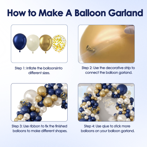 - 【Enjoyable DIY Assembly】 Easily build your dream garland! Inflate the navy blue balloons, off white sand balloons, chrome gold balloons with a pump (to 90% full), then attach them to the included strip. This blue and gold balloon arch kit makes professional decorating effortless for anyone.