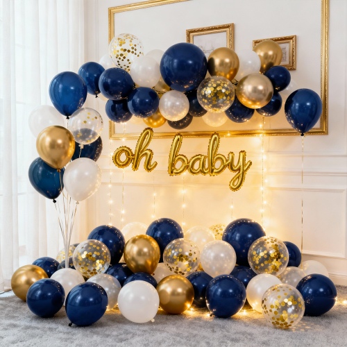 - 【Navy Blue Gold Balloons Arch Kit】This royal blue and gold balloon arch kit contains 119 pcs for a stunning display: 42 navy blue balloons, 32 elegant pearl cream white sand balloons, 35 shiny chrome gold balloons, 10 gold confetti balloons, 1 roll of decorative strip and 5pcs balloon glue points. Create a perfect mix of royal blue white gold balloons arch.